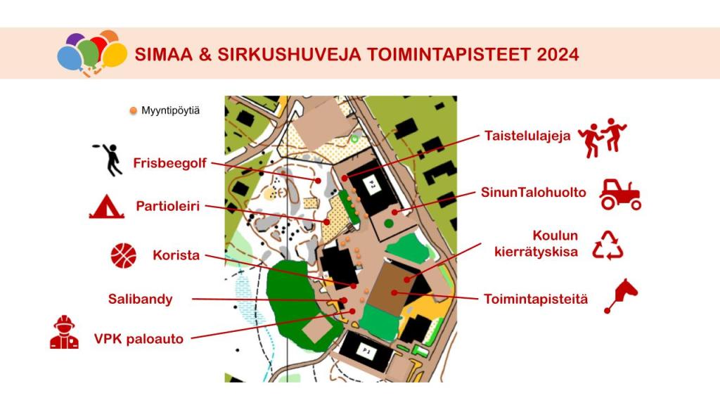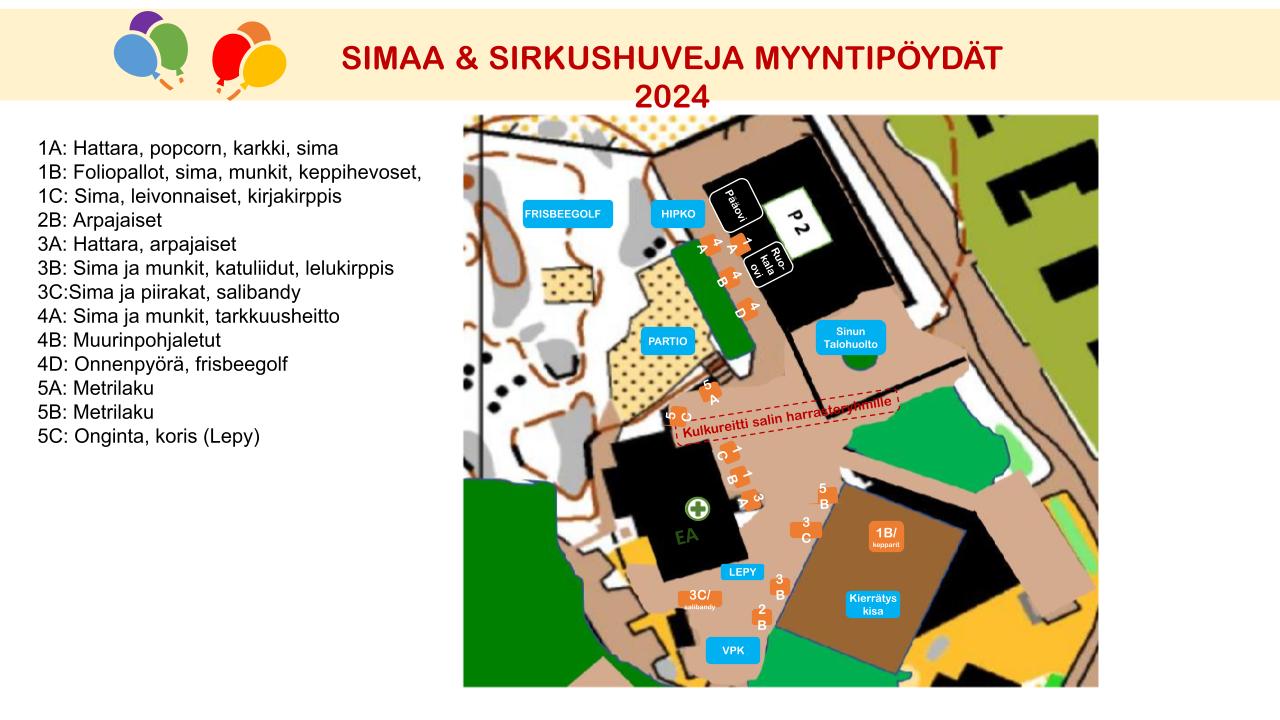 Toimintapisteet: arpajaiset, onnenpyörä, lelukirppis, kirjakirppis, keppihevosrata, salibandy, frisbeegolf, jalkapallo