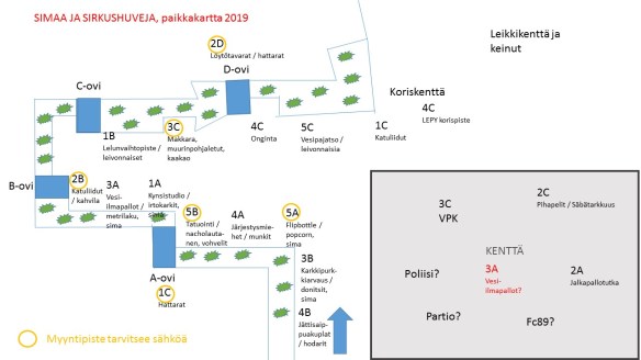 Luokkien myyntipisteiden ja kentällä olevien toimintojen sijoittuminen on esitetty alla olevassa kartassa.